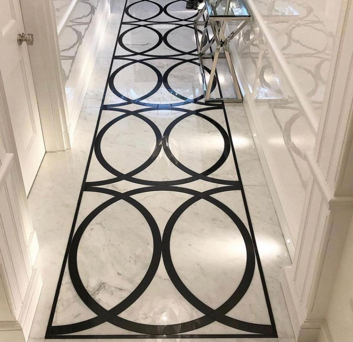 Pardoseala cu intarsie realizată din Marmură Carrara și Granit Negru Absolut creează un contrast elegant și sofisticat. Albul pur al marmurii combinat cu negrul intens al granitului adaugă un plus de rafinament și stil.